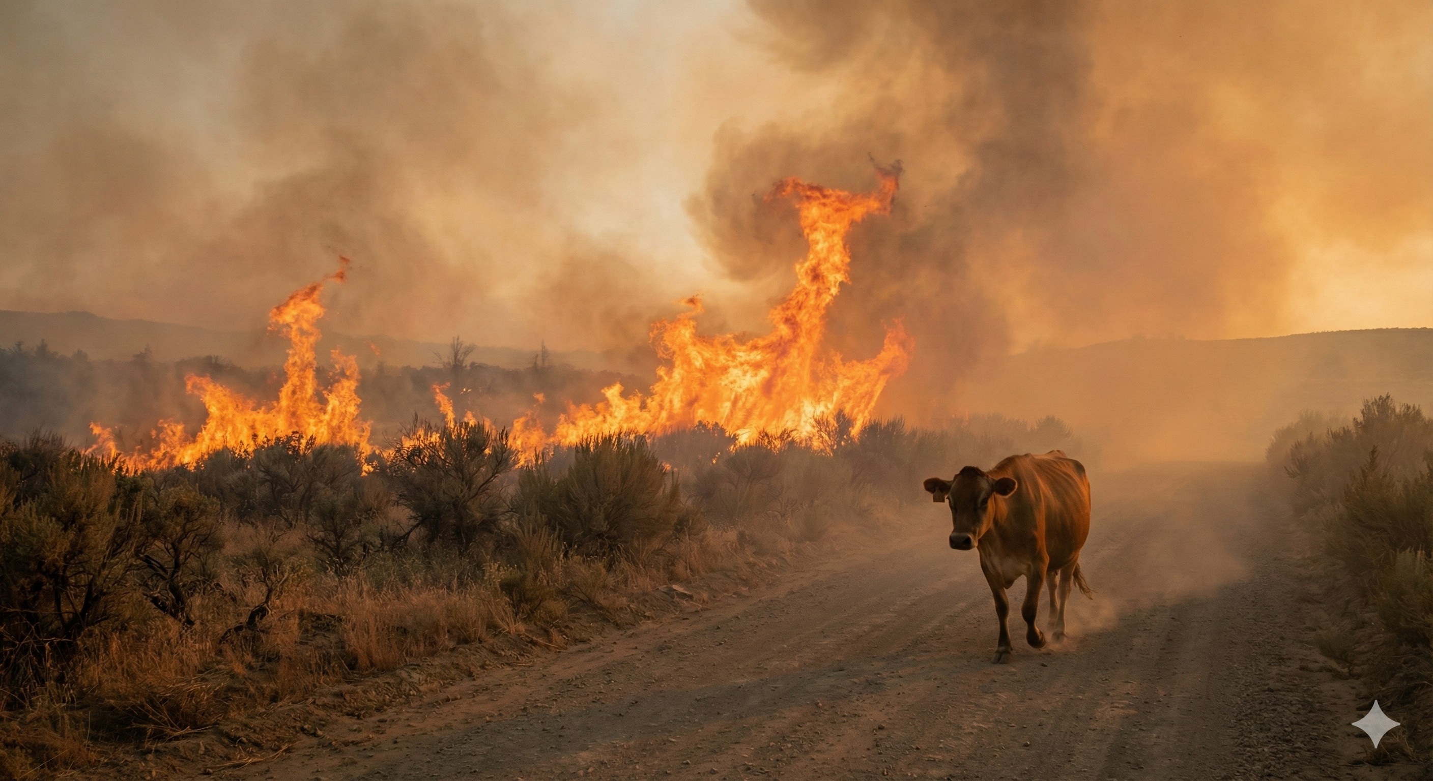 一頭母牛從火焰旁走過,這起火來自「森林野火」。(圖片由AI生成)