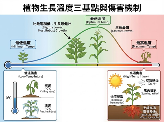 每一種植物都會有其適當的生長溫度範圍,甚至同一種植物、不同的發育時間也會有不同的溫度範圍。溫度與植物生長的關係,通常會以「生長溫度三基點」來說明:最低溫度、最高溫度與最適溫度。植物只能在最低溫度與最高溫度間生長,而在最適溫度時,植物的生長速率會最快。不過,想要植物生長最健壯,卻必須將溫度控制在比最適溫度稍低的溫度下。