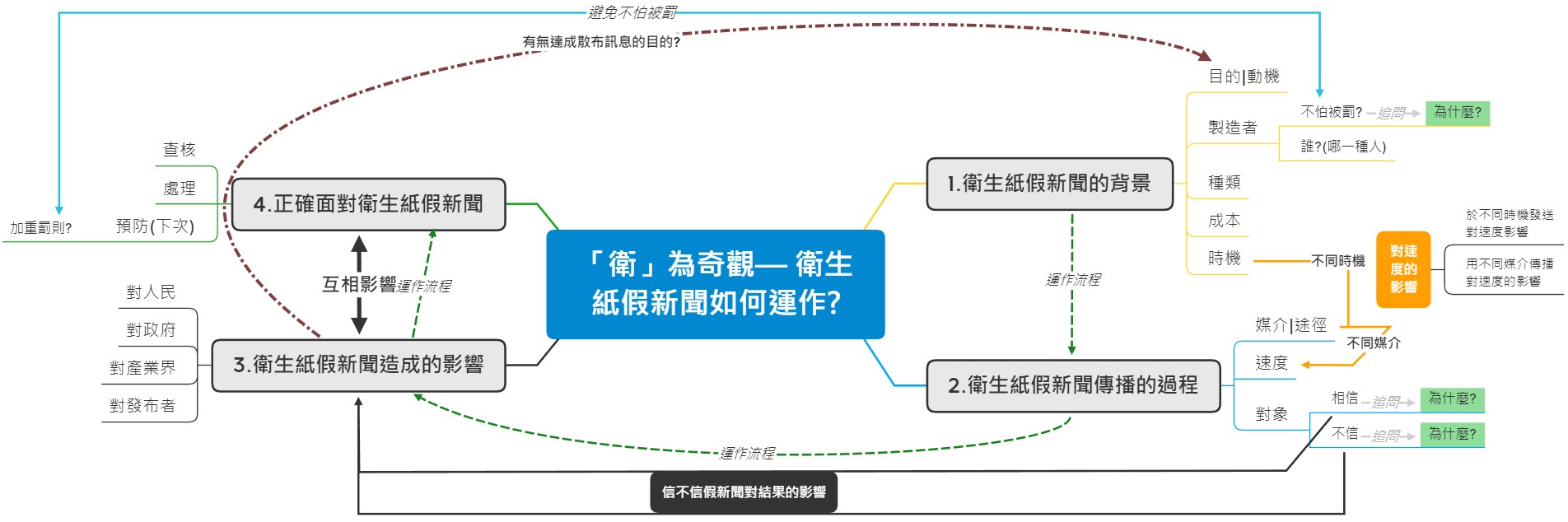 我們想了解衛生紙假新聞的運作,首先要知道衛生紙假新聞是怎麼來的?於是先從它的目的、製造者、種類、成本及時機來探討。接著,這些被製造出來的衛生紙假新聞如何擴散、不停的跑?這可以從傳播的媒介途徑、速度和對象進行分析。至於收到訊息的對象會不會相信?為什麼?衛生紙假新聞到底幹了什麼好事?我們彙整資料後,從人民、政府、產業界和發布者四個向度來剖析它造成的影響。研究最後希望能找到面對假新聞的好辦法,了解訊息查核、處理和預防的觀念及步驟,來揭開衛生紙假新聞的祕密。