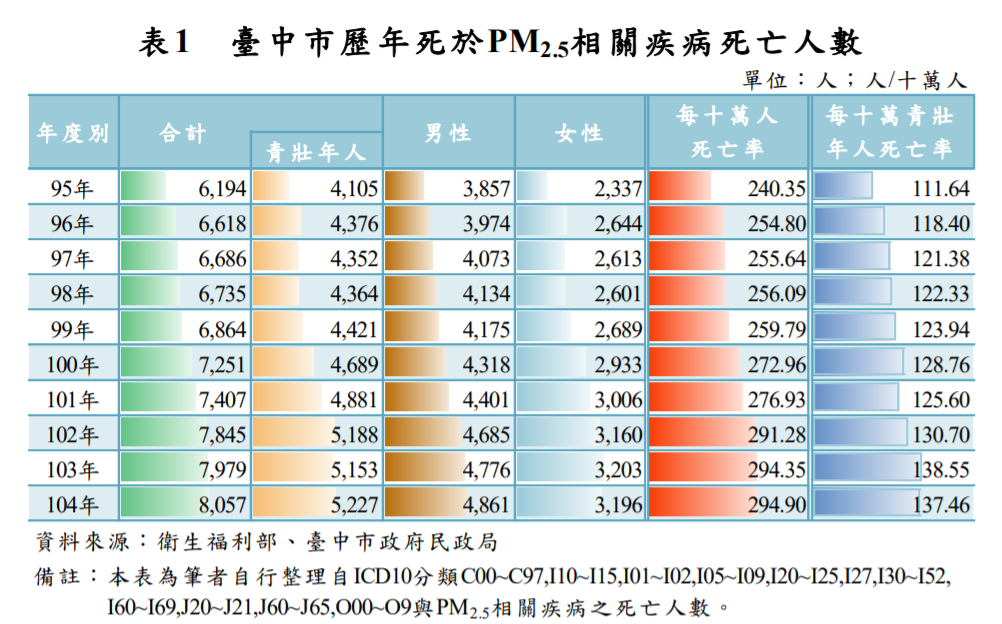 表3-2臺中市歷年死於PM2.5相關疾病死亡人數