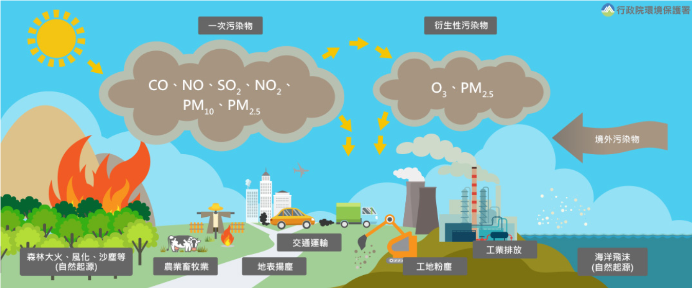 有許許多多的報導都說:臺中空汙最大的兇手就是臺中火力發電廠。因此讓人一聽到空汙,就會聯想到火力發電廠,所以,我們想知道空汙真的全是火力發電廠的錯嗎?根據環境保護署空氣品質監測網的資料中,我們了解到空氣汙染物有來自然界活動的汙染物,也有來自人類活動釋出的汙染物,還有來自境外飄散過來的汙染物,就好像從大陸吹過來的霧霾(如圖3-1)。