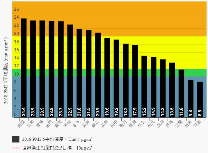 既然人為活動多是造成空氣污染的主因,我們推測六都的人口數較多、工廠也很多的情形下,六都應該包辦空汙最嚴重的六縣市吧?但是從未來城市網站的資料,我們發現高雄市當選2018年PM2.5濃度最高的城市,而臺中市是19.2μg/m3,雖然在全臺各縣市中只排第11名;可是奇怪的是,人口數最多的新北市所監測出來的空氣品質卻比臺中市還要好,為什麼臺中的空氣污染比會北部的桃園、新北以及臺北還要嚴重啊? (如圖3-2)