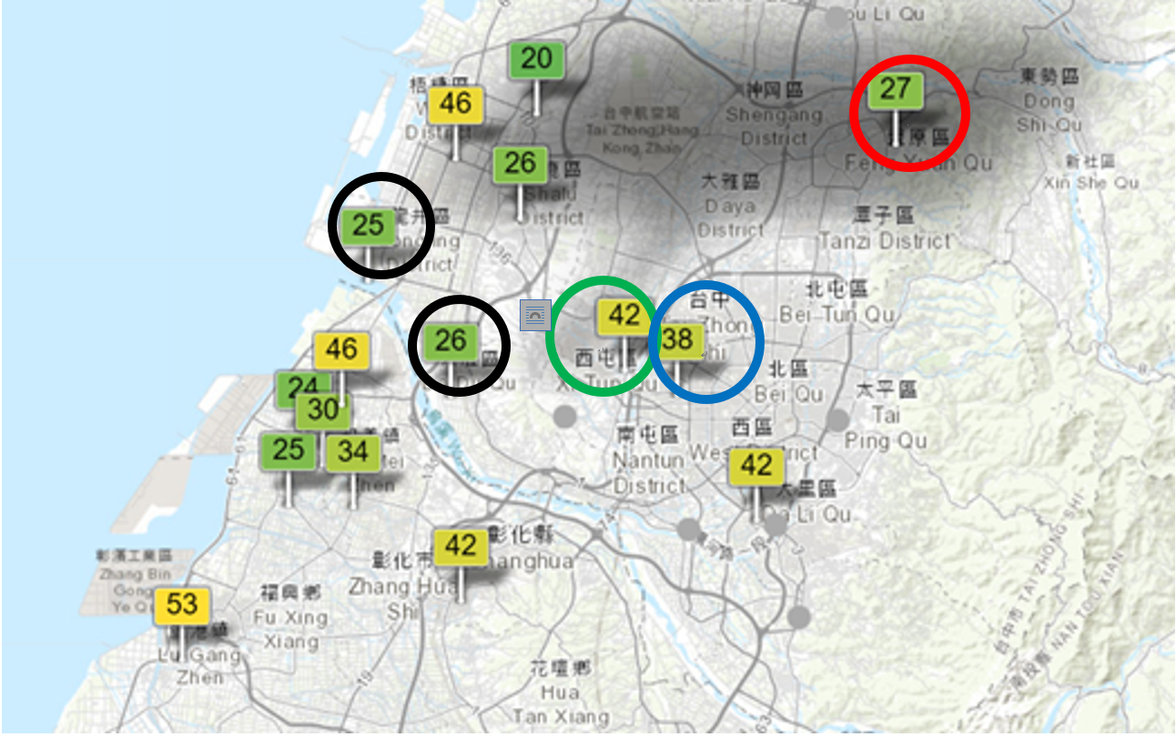 我們決定再仔細觀察地圖,推測可能是因為豐原位於大甲溪旁,懷疑河川的水氣可能有有清淨PM2.5的功能,再對照沿著烏溪沿岸所監測的空氣品質真的也比較好,可見「地理環境的水氣量」也影響著臺中市各區域的空氣品質。