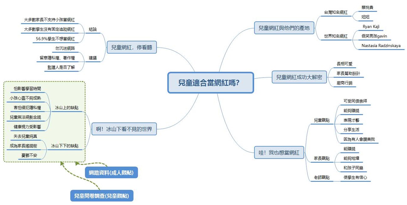 我們本來認為兒童不適合擔任網紅,但是指導老師有在班上討論這個議題,讓我們很訝異,同學覺得從小培養挫折忍受力,就不會怕網路負評或霸凌問題。建議高年級可以討論這個議題,讓一昧想當網紅賺錢的同學知道,網紅不好當,但也可以知道如何調整成為網紅後的心態。
