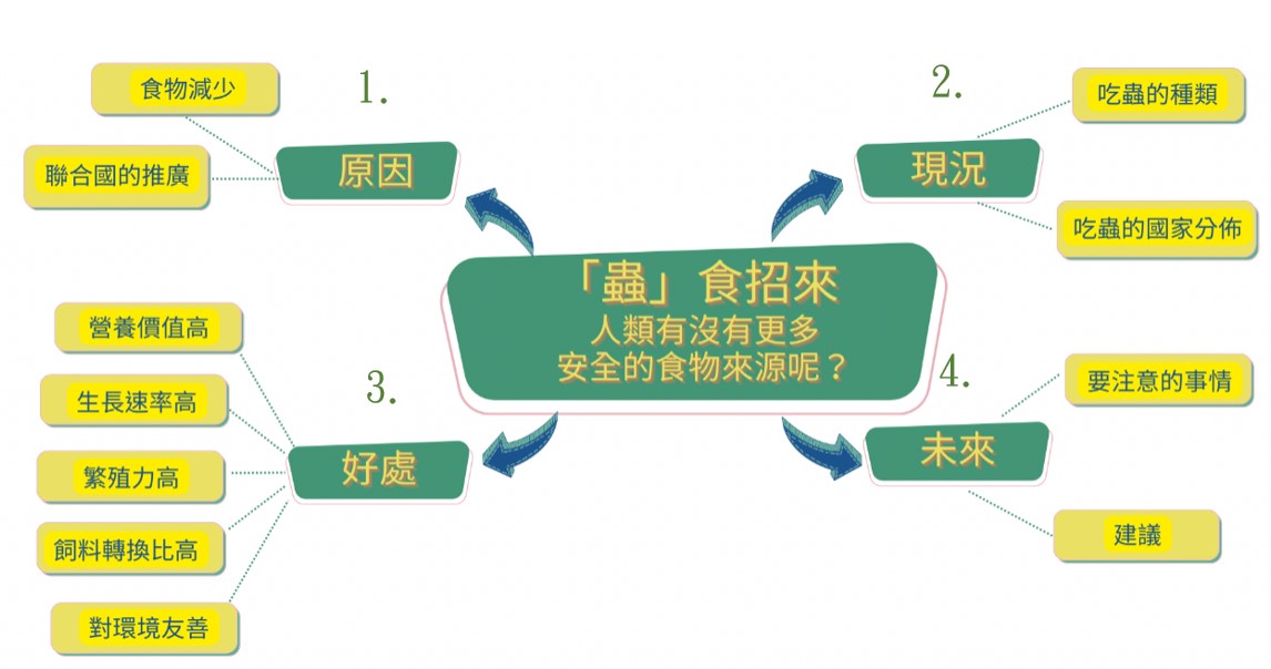 我們想了解是否有更多糧食可以供人類食用,首先要知道吃昆蟲的好處有沒有比牛豬羊來得多,對環境是否更友善,於是先從人類吃昆蟲的現況來探討,因此我們從食用昆蟲的種類和吃蟲的國家分布進行分析。再來,我們從資源利用、營養學、文化與社會、環保與疾病等五個面向來蒐集吃蟲的好處。研究最後,我們提出一些未來須注意的事項,例如有些昆蟲有毒性、或者有致癌物,建議政府要落實嚴格管控,積極開發食用昆蟲食譜或創新料理方式,透過教育推廣,以提升消費/接受度,希望安全的食蟲可以解決人類糧食不足的問題。