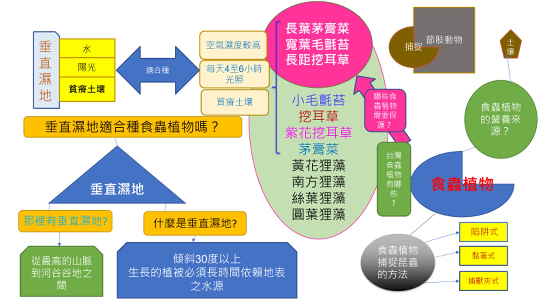 學校在生態池旁的大石頭上,營造一個垂直溼地的生態,我們想探究臺灣食蟲植物適不適合在垂直溼地生長,發現食蟲植物需在多水、少營養土壤和6到8小時陽光的環境,我們找出了在臺灣食蟲植物中長葉茅膏菜、寬葉毛氈苔、茅膏菜、小毛氈苔四種都適合生長在山谷的溼地,而,挖耳草、長距挖耳草、圓葉狸藻、紫花挖耳草四種可出現在長年有水的岩璧上,也就是說,從最高的山脈到河谷谷地之間適合八種臺灣食蟲植物。