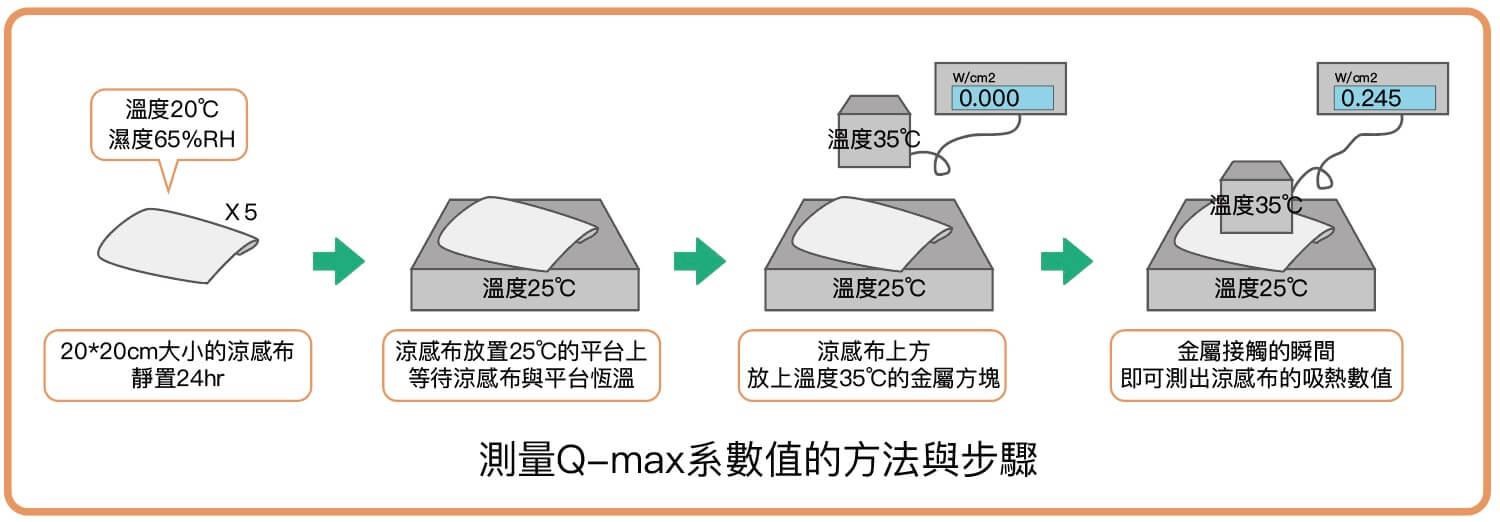 Q-Max檢測方法是把布料放在25度的實驗金屬平台上,上方放一個加熱至35度的金屬片,垂直接觸樣布,透過儀器感測出瞬間熱流失量,測出的數值就是Q-Max。