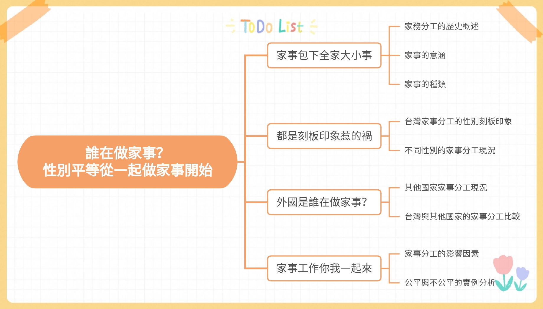 家庭裡的家事到底誰在做呢?首先我們想要先瞭解家事的定義,包含什麼是家事、家事有哪些項目;探討家事分工會不會因為性別而有所差異,也著眼其他國家的家事分工現況與台灣比較,來探討家事分工的公平性。