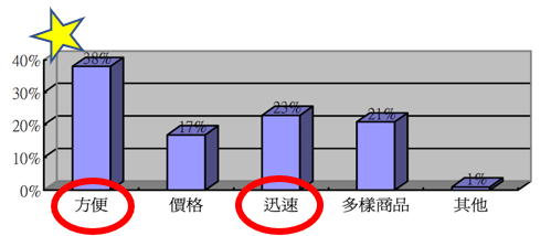 由上圖,我們可以看到,網路書店吸引人的地方,在「方便性」與「迅速」兩部份比例最高。