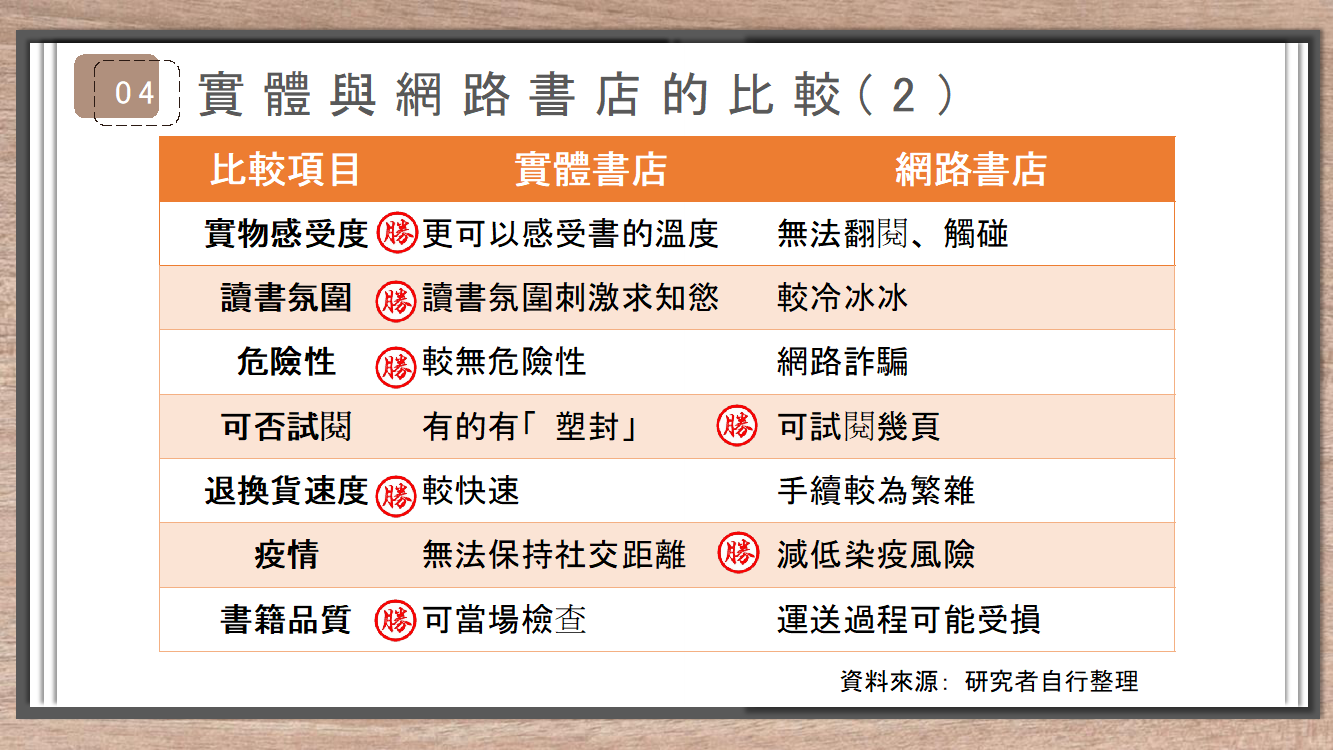 透過探究,我們發現實體書店與網路書店各佔勝場。從時間、效率、書況、價格、分類、保存與攜帶上,以網路書店略勝一籌,然而,實體書店也有其優勢,它更可以感受得到書的溫度,讀書氛圍也可以刺激消費者的求知慾,同時沒有網路詐騙的問題;網路書店的書一般可以試閱幾頁;實體書店的退換貨速度比較方便且快速;在疫情方面,網路書店可以降低染疫的風險,實體書店則可以當場檢查書籍品質。
