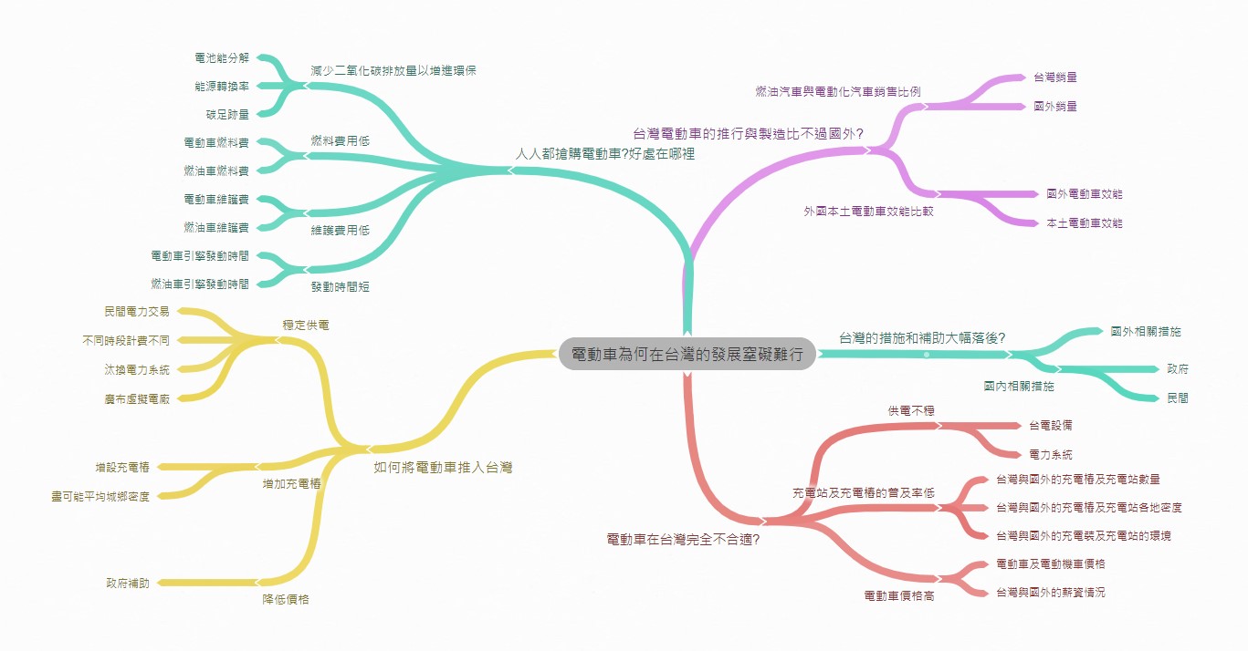 經過我們的探究,我們發現電動車有許多的優勢,不僅能促進環保、維修費用與燃料價錢也較燃油車低廉,到2021年為止,全世界的總汽車輛中佔比 9%。但是唯獨在臺灣,電動車只佔了總車輛的0.16%,明顯可看出臺灣在電動車的發展窒礙難行。