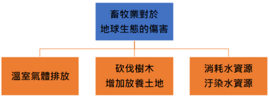 從圖一可知,為了豢養更多的經濟動物讓人類食用,不只是消耗了大量的穀物之外,同時也對於增加了溫室氣體的排放;砍伐更多樹木增加農地,加劇暖化和土地沙漠化;消耗大量水資源及汙染水資源,這些都會讓地球生態的破壞加劇。