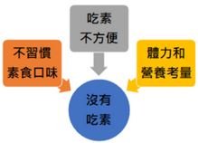 從圖二可知,飲食習慣是降低吃素的意願之一。一直沒有吃素的原因,主要是不習慣素食口味;過去有吃素現在卻沒有的原因,以吃素不方便佔了百分之二十六,接著是不習慣素食口味佔百分之十八,然後是體力及營養的考量佔百分之十五,可見飲食習慣和吃素便利性是影響人們願意吃素與否的主因。
