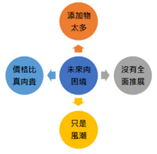 從圖三可看到未來肉在推展上面臨了四點困境,其一是未來肉為了讓口感像真肉,往往添加較多的鹽和調味料來調味,對身體易有負擔,素食主義者有部分群體視其為加工產品,不認可營養與對身體健康的影響;第二是目前未來肉的生產價格還比真肉貴,影響消費者購買意願;第三雖然麥當勞和漢堡王等業者有規出未來肉相關產品,但實際大多只在小範圍區域販售相關產品;第四是葷食消費者容易視植物肉為「風潮」,可能會因好奇、新鮮感嘗試一兩次,但價格高、味道、口感等問題,難以讓這些人成為忠實主顧,這些都是未來肉在推展上的困境。