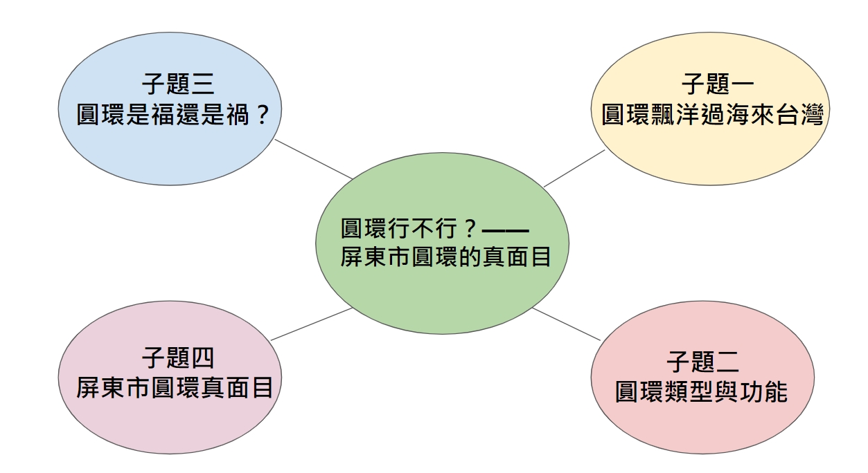 我們想了解圓環的演變歷史與相關的行駛規範,於是先從臺灣圓環設立的由來開始認識,接著了解圓環的類型與功能演變、造成的交通現象與改善建議,再將找到的資料彙整成觀察紀錄表,到屏東市的三個圓環作實地觀察,我們紀錄下圓環內車輛行駛的情形,將所觀察到的紀錄進行整理,最後提出可改善的建議。