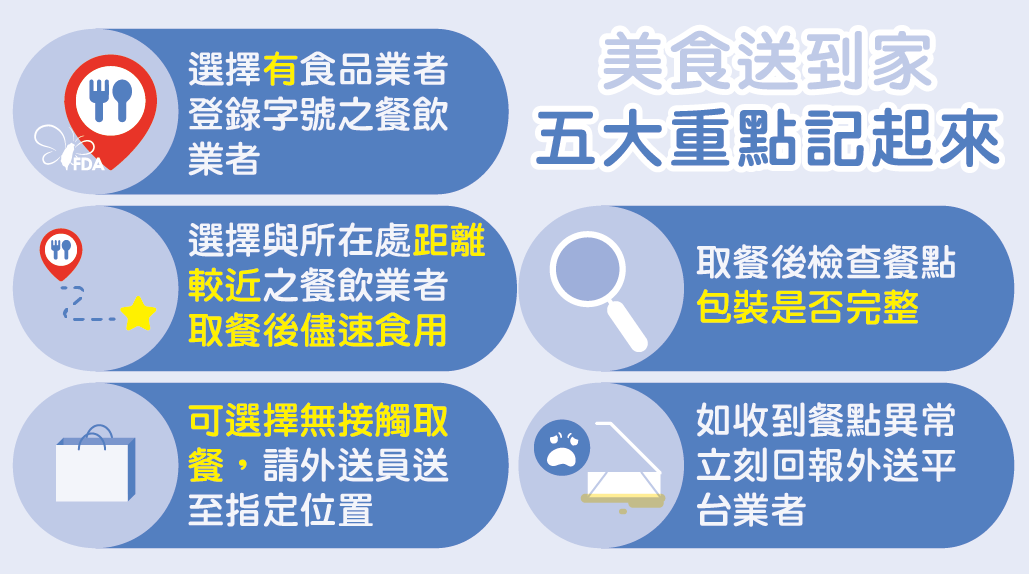 民眾則建議可以設立外送區(桌櫃)、查詢合作的餐飲業者的衛生狀況、在收取時確認食品的狀態、注意熱食從完成後是否已經超過一小時、冷食是否有完整包裝等八個注意事項;而店家只能看看有沒有辦法再更強化食品包裝(加蓋、保溫)。