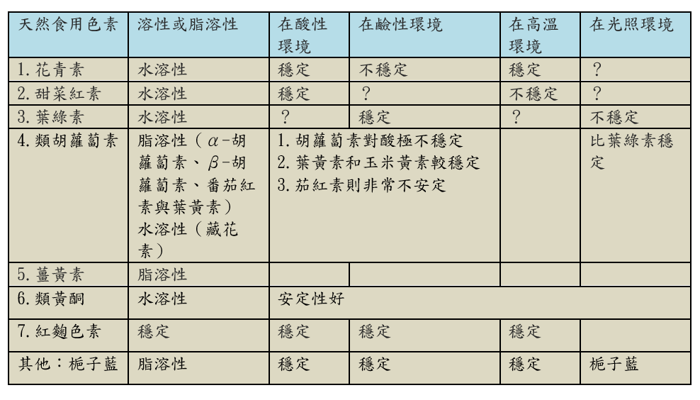 我們搜集並整理了不同天然食用色素的特性,包括水溶性或脂溶性、耐光性、在酸、鹼環境下的穩定性、耐熱性等,並將結果整理於表三,以便大家更直觀的進行比較與了解。