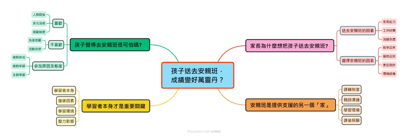我們從蒐集的資料當中發現,有一些家長因為工作因素無法準時接送孩子,因此只能選擇將孩子送去安親班;而有些家長雖然有辦法準時接孩子回家,但是因為自己沒有辦法指導孩子功課,或者是對於孩子的學習狀況感到無能為力,因此只能選擇把孩子送去安親班。