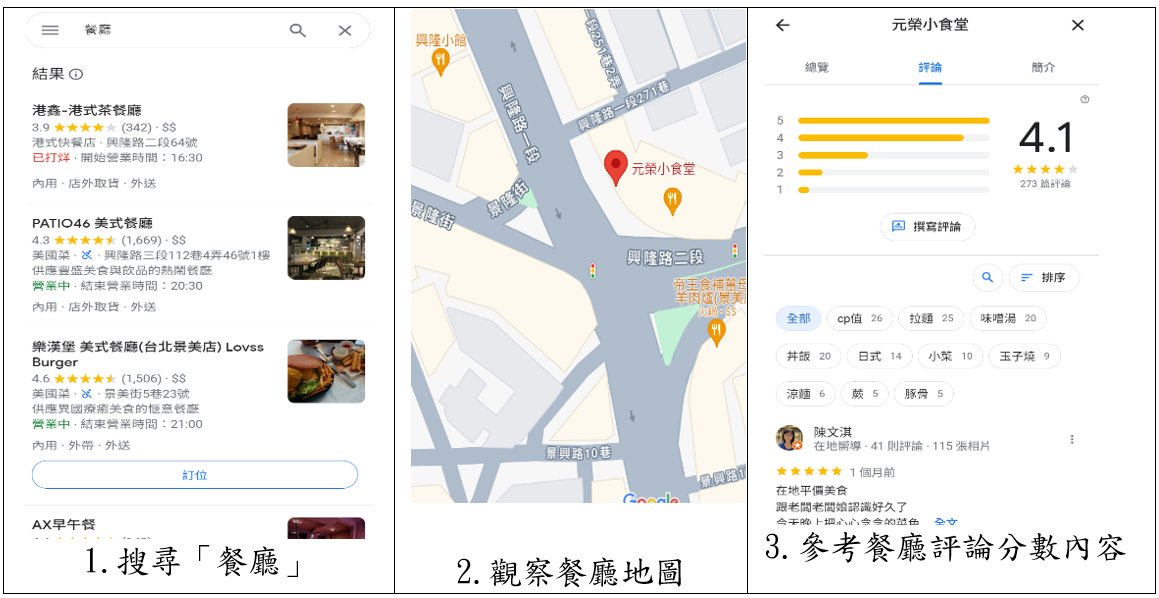 現在人們使用手機上網很方便,很多人習慣在到餐廳消費前,搜尋其他消費者對於餐廳的評價。搜尋者只要在 Google 地圖上使用餐廳搜尋的功能,當搜尋結果出現時,Google 就會同時列出這些餐廳的資訊。或者在 Google 地圖上找到附近的餐廳時,點選該地點,可以看到商家的 Google 星級(評分)與評論總數,再進入餐廳的介紹頁面,可查看更多資訊,包括餐廳的聯絡電話與地址、營業時間、熱門時段、熱門評論、照片等,如圖2。