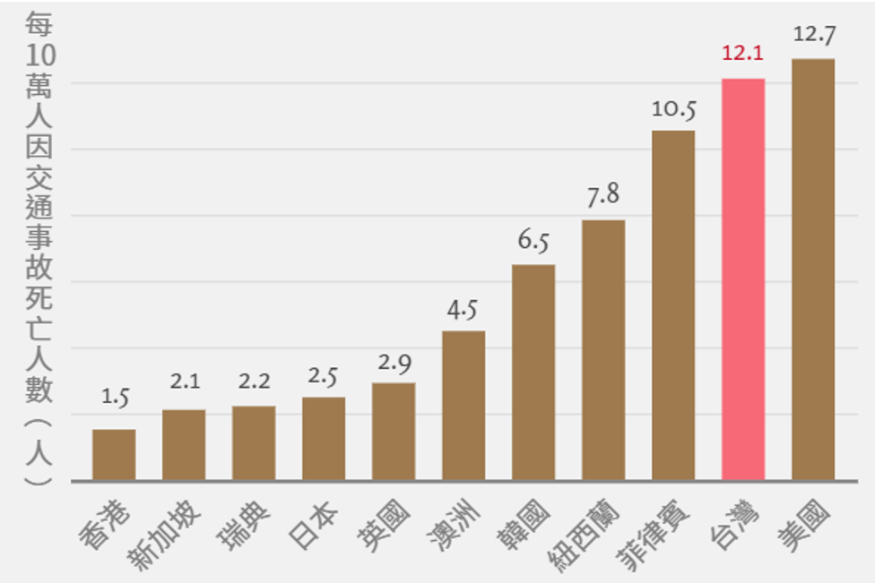 - 臺灣與OECD及亞洲國家相比,交通死亡率偏高。2021年臺灣有 2,962 人因交通事故喪生,相當於每 10 萬人中有 12.67 人死亡,是日本的六倍,是英國的五倍。