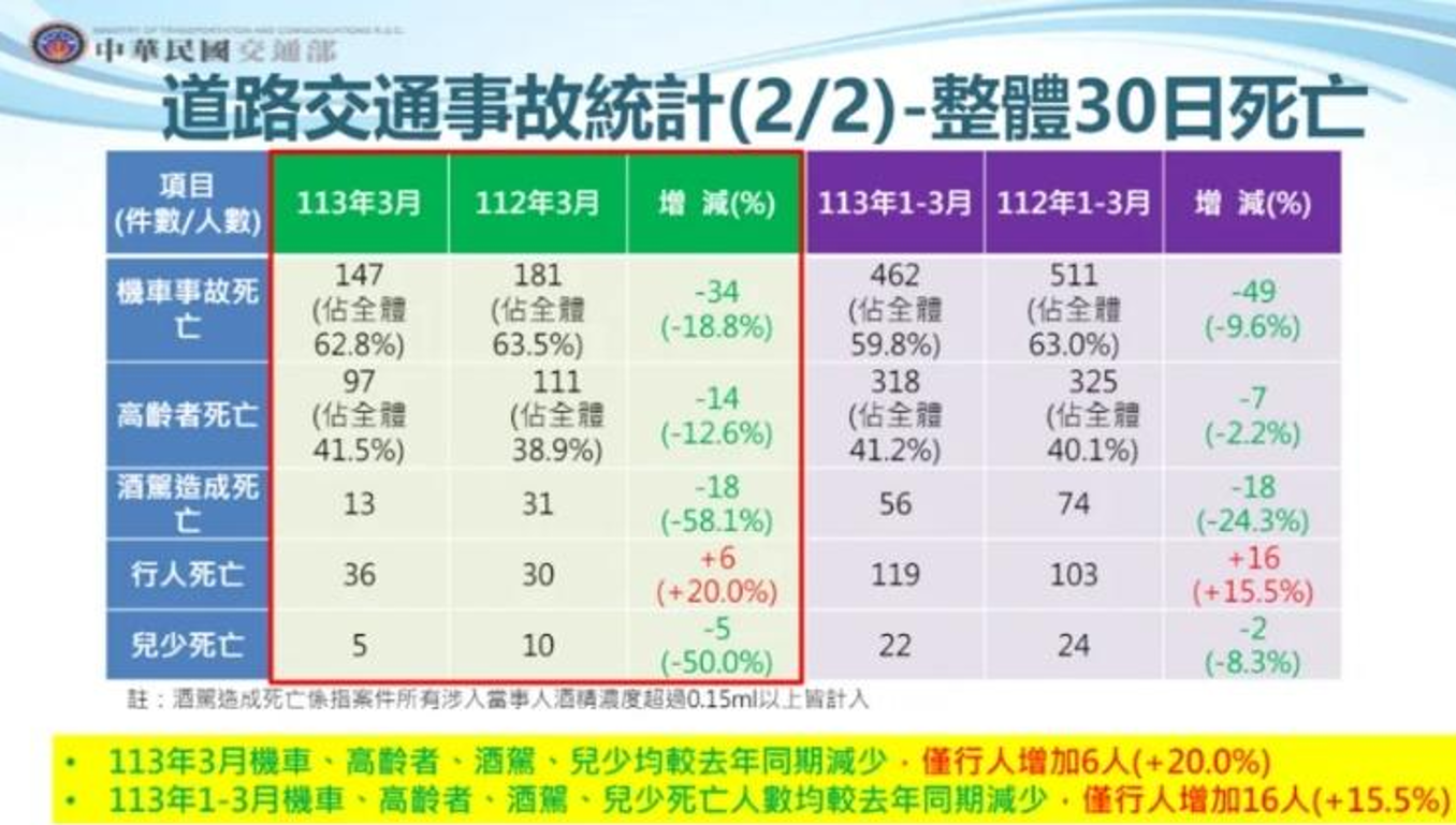- 中華民國交通部針對2024年1-3月行人事故分析,行人死亡以第二當事人為主,其中6成9是遭汽車碰撞,年齡層以高齡者占73.1%最多;時間多集中於清晨4-8時,與傍晚18-20時。肇因部分,路口主要是車輛不停讓行人,至於路段為行人未依標線或標誌穿越道路。在路口不停讓而造成行人死亡部分,2023年1到3月有11人,2024年則是1到3月24人,增加2倍多。交通部研判2023年曾因加強執法,行人路口死亡下降。