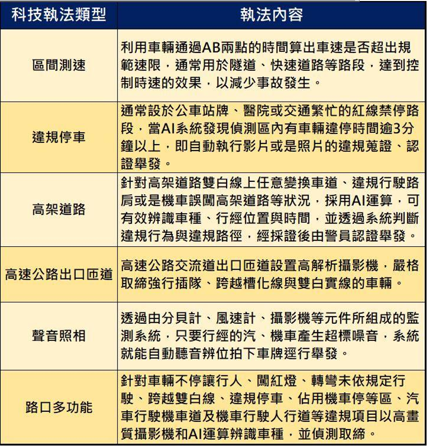 科技執法種類包含區間測速、違規停車、高架道路、高速公路出口匝道、聲音照相、路口多功能科技執法等,其中路口多功能科技執法結合AI影像辨識技術,可進行未禮讓行人之科技執法。