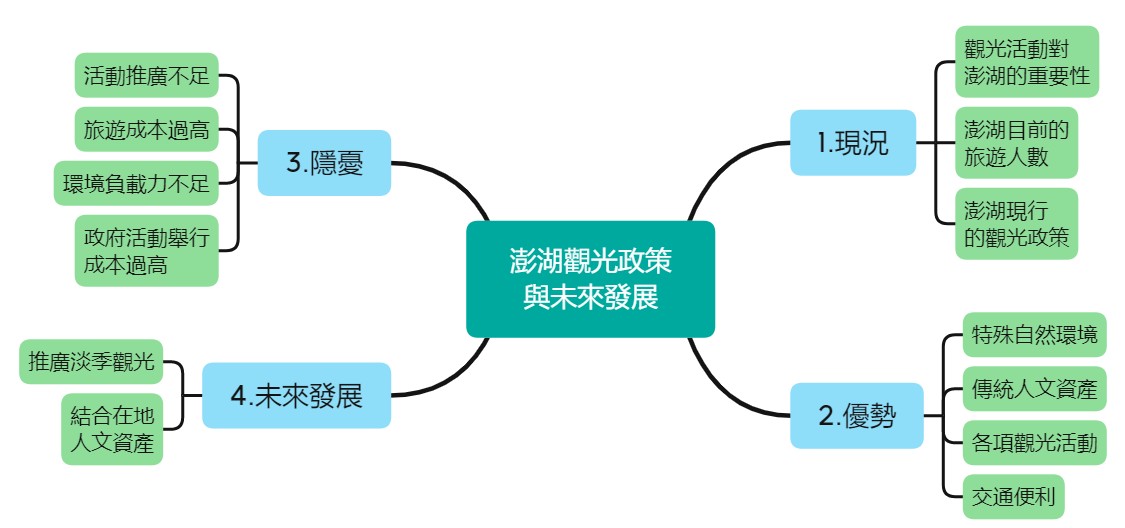此外,這次探究受限於時間,我們提出的優缺點主要採納當地民眾的意見,也沒有機會設計問卷進行嚴謹的統計。因此,我認為我們未來可以透過問卷及訪談的方式,了解台灣其他地區,甚至是其他國家遊客對於目前澎湖觀光發展的想法及建議。將所得到結果互相比對、歸納後,可以獲得澎湖觀光產業更多元也更完整的優勢及劣勢,並持續讓產業改進及成長。