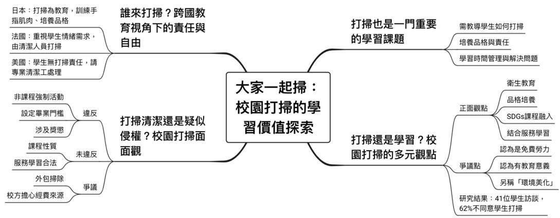 其次,大眾對於校園打掃的看法並不一致。有些人認為它應被重新定位為「環境美化」,以正面方式鼓勵學生參與;部分學校能結合 SDGs 永續課程,讓學生自由選擇服務時段。教育主管與學生會成員多半肯定這些安排能增進學習,但調查結果卻顯示,大多數學生仍不喜歡打掃,顯見理念與實際之間存在落差。