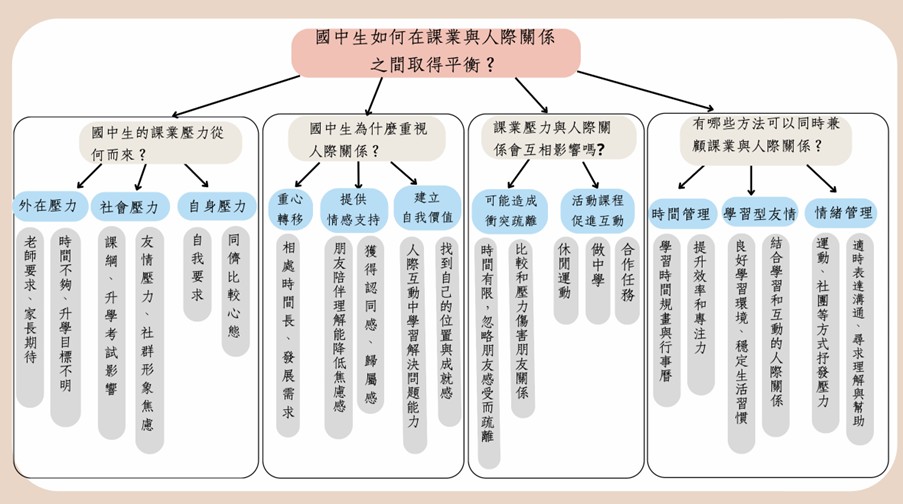 國中生在成長過程中,同時面臨課業與人際關係的挑戰。我們發現,課業與人際關係的壓力其實是同時存在且互相影響的。當課業負擔過重時,情緒容易不穩,可能影響友情;相對來說,人際關係不順,也會讓學習動力下降。課業壓力主要來自升學競爭、家長期待與自我要求,而人際關係則是青少年生活中的重要支持來源。這兩者互相作用,過大的壓力可能造成與朋友的疏離,而良好的人際互動則能幫助舒緩壓力。對國中生而言,壓力往往不僅來自課業,也會與人際關係交織影響。