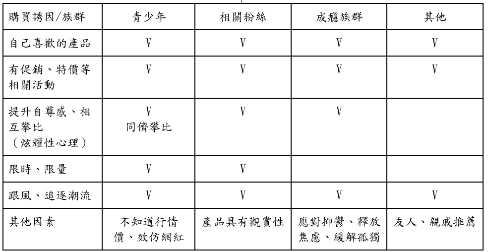 在分析多起案例後,我們歸納出幾個較容易被引誘的消費族群,大致將他們分類為:青少年、品牌或作品、成癮族群及其他族群。各式族群的消費誘因不盡相同,為了更清楚的比較,我們將其整理如下表。