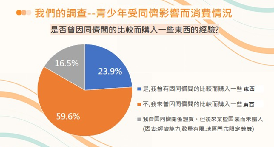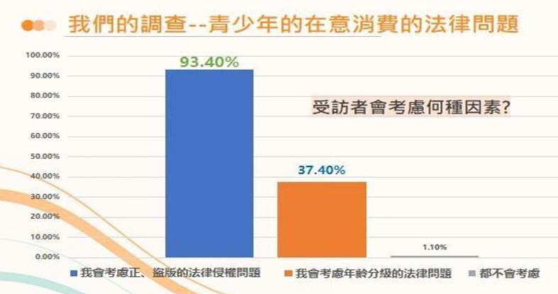 有趣的是,由我們所自製的問卷表單卻得到了不同的結果,在我們的調查中發現,青少年自覺自己在消費時有保持理性,較不會因潮流、同儕引響而消費;對於版權的相關問題也比想像中更關注。